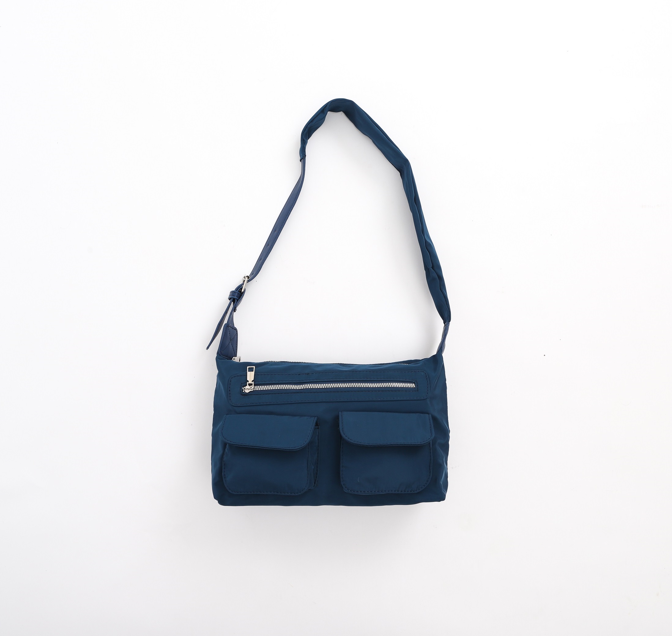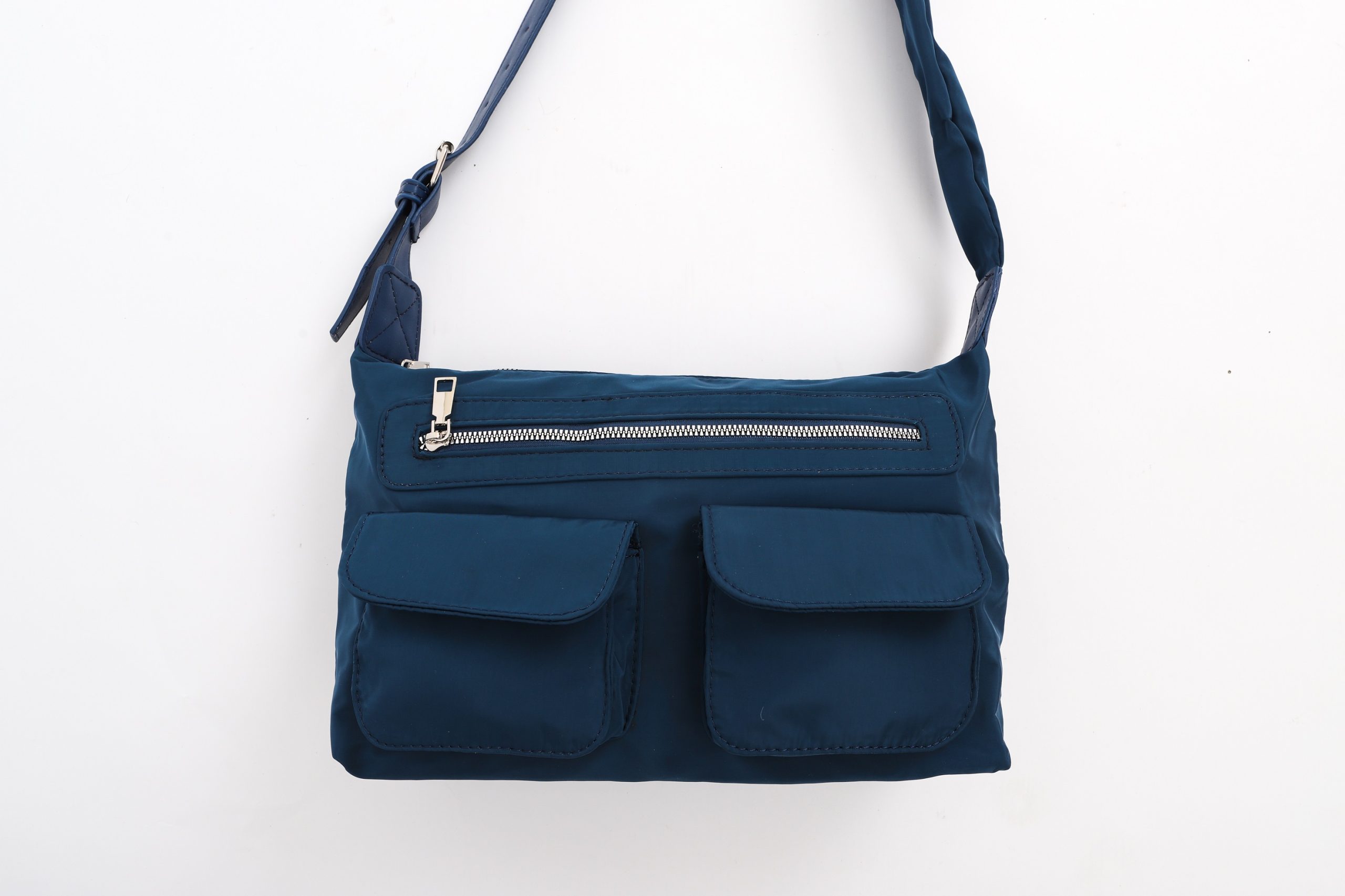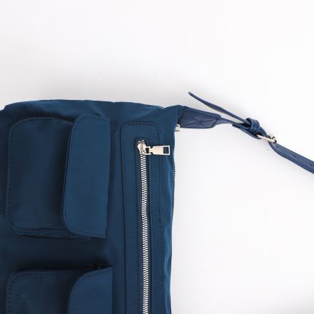 This bag includes an exterior zipper closure, 1 inner zipper pocket, 1 inner pocket, 1 zipper external pocket on the front, 2 external clasp pockets on the front.
